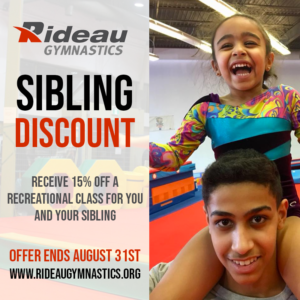 Take advantage of our sibling discount this week. Each child will receive 15% off fall session. Please email admin@rideaugymnastics.org